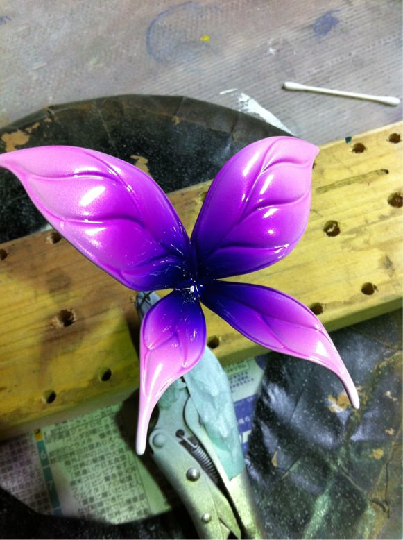 外側ピンク、中心に向ってだんだん濃くなるバイオレットのグラデーション✨サクッと決まりましたアイフォン画像では青く見えるかも?乾燥後に縁取りの黒を筆で入れて、もう一回最終仕上げクリアーでバリ艶仕上げにしてやります!
